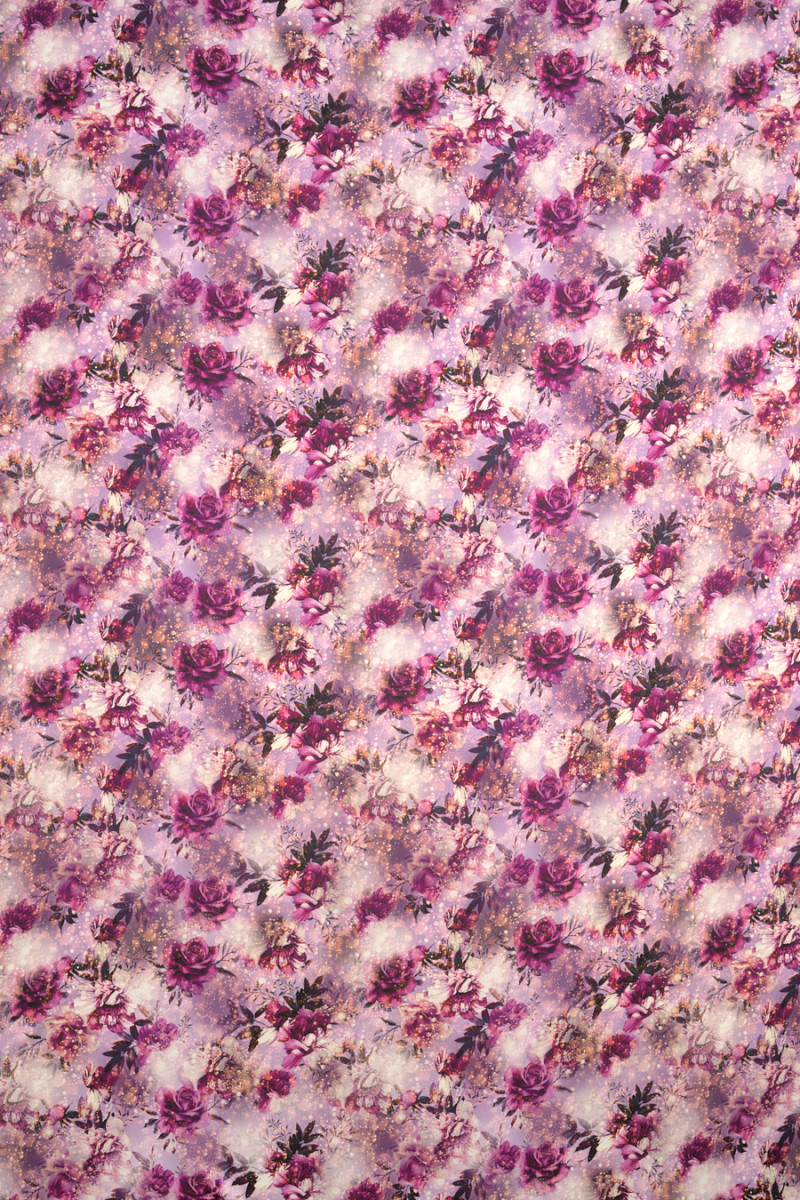 Італійський шовковий атлас з додаванням еластану з принтом, виконаним на матовій стороні. Красивий, щільний мотив квітів троянд фіолетових кольорів з чорними і кремовими акцентами. Все це виконано на затіненому фіолетово-кремовому тлі з крихітними крапками, що нагадують сніг. Фантастична пропозиція для людей, які люблять квіткові мотиви в спокійних тонах. Ця тканина відмінно підійде для пошиття сукні, спідниці або красивої сорочки.
