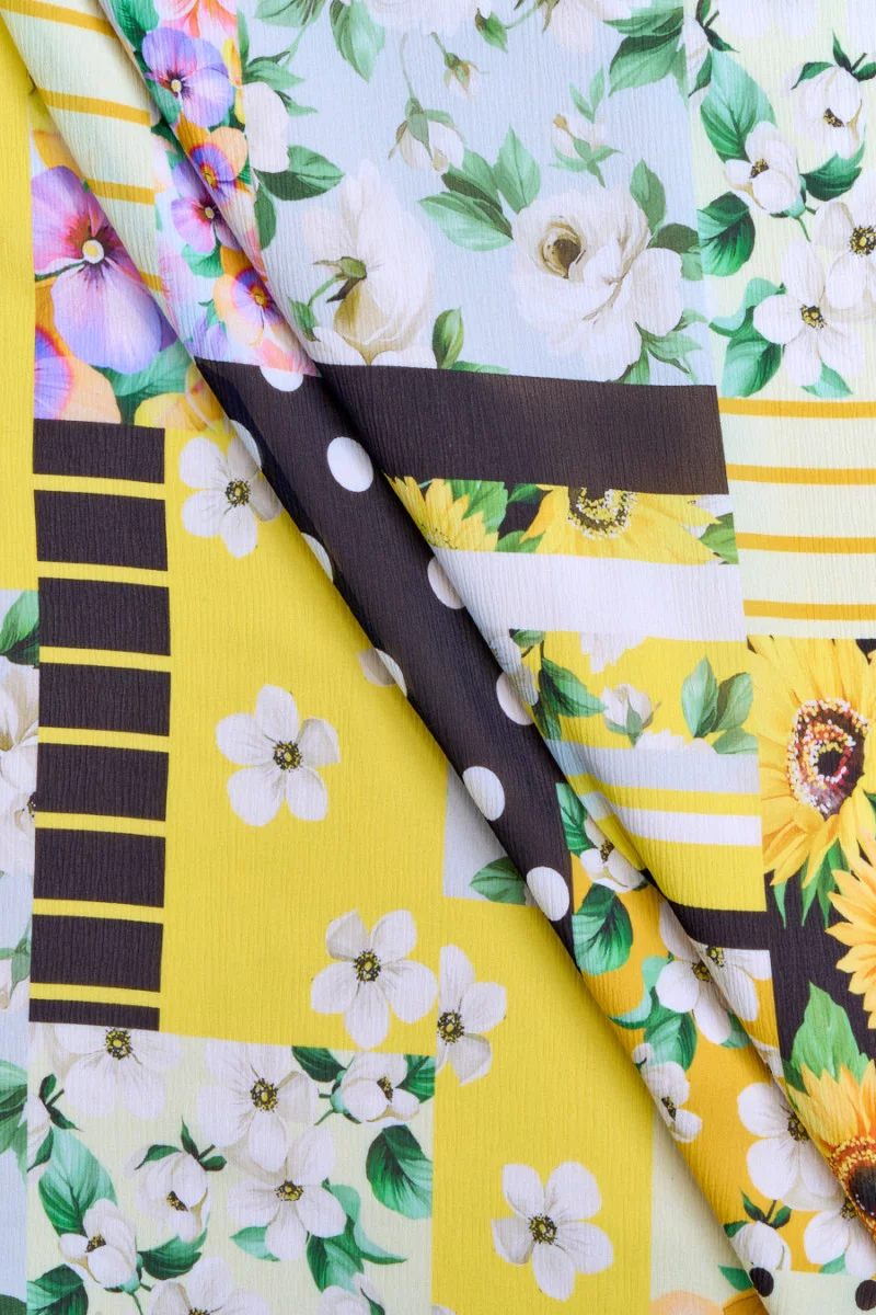 Італійський шифон зі 100% шовку в складках з квітковим мотивом, оформленим у вигляді печворку в домінуючому жовтому кольорі і контрастує з ним чорним. Цікаве поєднання чітких соняшників з ніжними братками і трояндами, а також крапок і рисок створює оригінальний візерунок матеріалу. Тканина легка, повітряна, злегка прозора, еластична - працює на нитках. Красива пропозиція для створення унікальної сукні, блузки або шарфа.