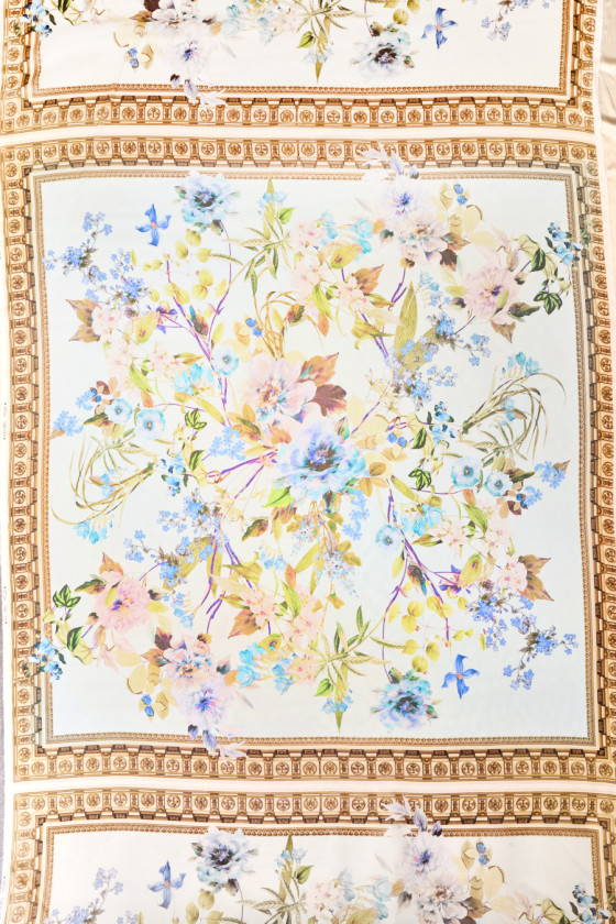 Італійський муслін зі 100% шовку з мотивом синіх і кремових квітів на світло-блакитному тлі в красиво оформленій оправі, що надає тканини елегантності. Тканина поставляється в купонах розмірами 140см*140см. Натуральний шовковий муслін - дуже ніжна, повітряна, прозора тканина з ніжним блиском, характерним для шовкових тканин. Ідеально підходить для легких суконь, блуз, спідниць.