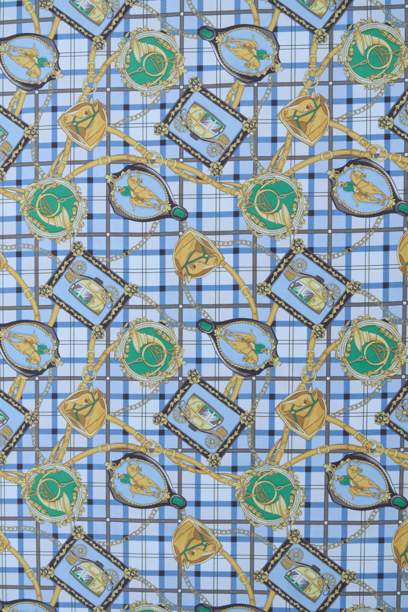 Італійський 100% шовковий креп з кінними мотивами на синьому тлі. Щільний кінний візерунок зображує регулярно розміщені зображення коня, карети, труби і вершника в декоративних рамках розміром від 5 см до 7 см. Фон тканини з картатим принтом додатково заповнений смужками і ланцюжками золотого кольору. Цікава пропозиція для шанувальників дизайнерського одягу, оскільки походить з колекції відомого модельєра. Тканина легка, струмлива, тонка, але непрозора, відмінно підійде для пошиття повітряної сукні, спідниці або блузки.