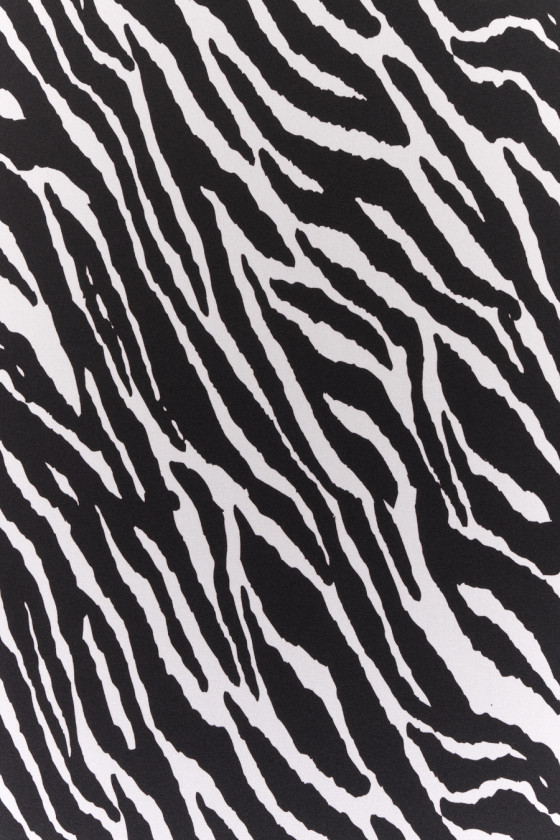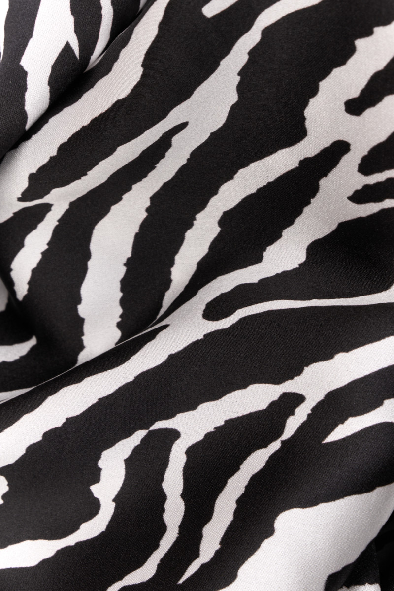 Італійський шовковий атлас з додаванням еластану в чорно-білому мотиві зебри середнього розміру. Тканина еластична, струмлива, ніжна на дотик, м'яка і непрозора. Класичний, позачасовий дизайн, який можна використовувати для створення ніжної сорочки, повітряної спідниці чи сукні.
