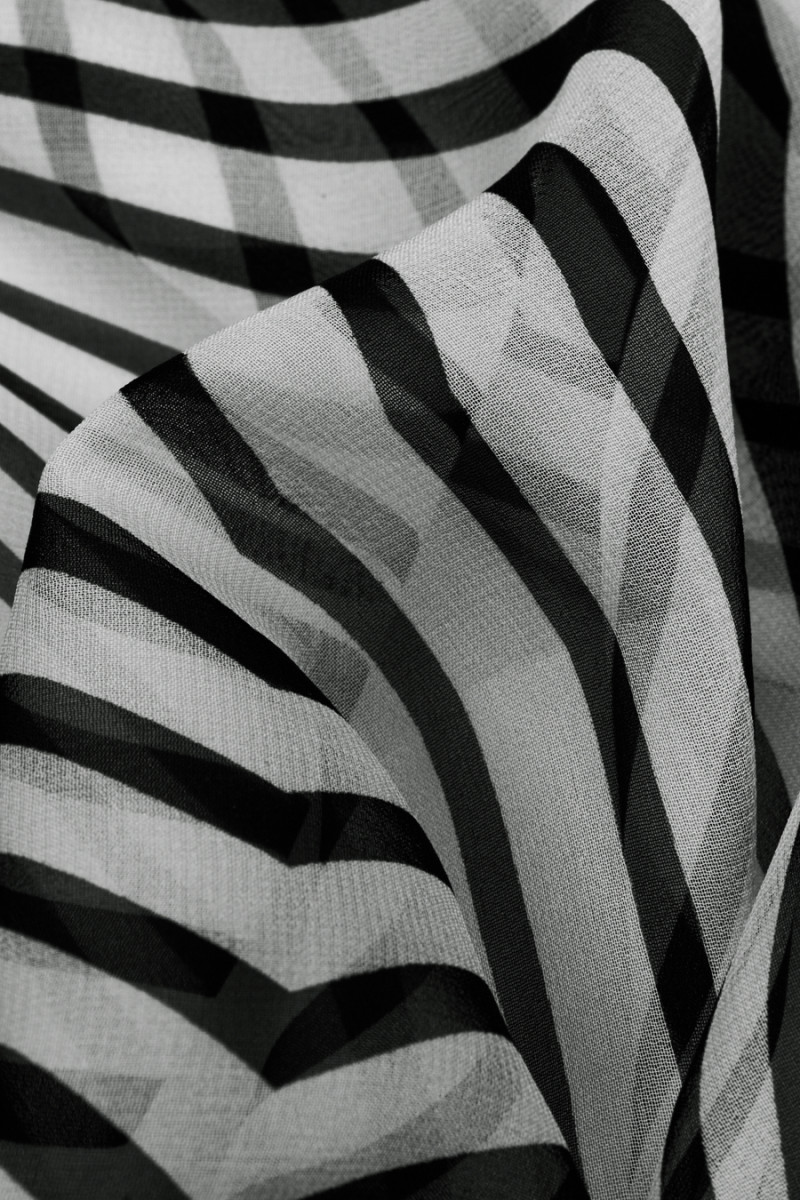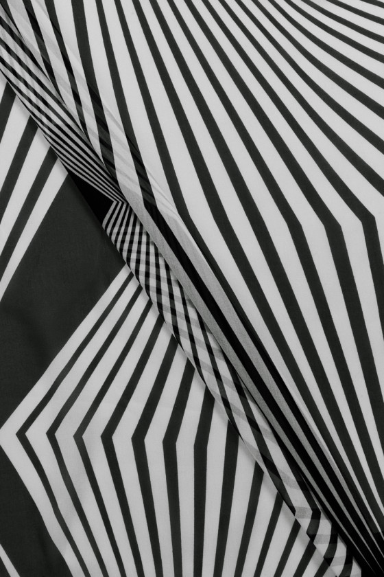Італійський шифон 100% шовк з чорно-білими геометричними великими візерунками. Тканина повітряна, легка, прозора і матова. Він походить з відомої колекції модного бренду. Шифон відмінно підійде для пошиття повітряного сукні, спідниці, а також сорочки або блузки.