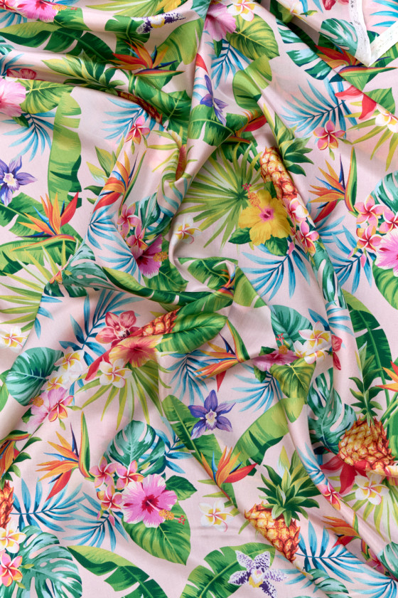 Італійський хаботай 100% шовк з тропічними, барвистими візерунками на світло-рожевому тлі. Щільні мотиви листя, квітів та ананасів, виконані у свіжих літніх кольорах. Тканина дуже легка, повітряна, нееластична, оброблена дуже ніжним блиском. Радісна і легка пропозиція, яка ідеально підійде для пошиття блузки, сорочки, сукні або туніки.