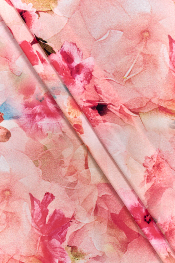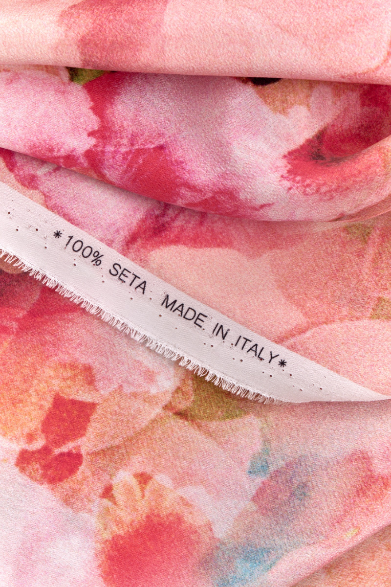 Італійський 100% шовковий креп з мотивом великих, пухнастих квітів рожевого, коралового та помаранчевого кольорів. Тканина ніжна, тонка, але непрозора, напівматова і легка. Романтична пропозиція, яка добре поєднується з літніми сукнями, спідницями, блузами.