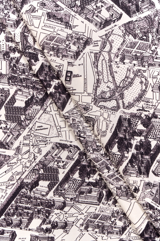 Італійська шовкова тканина з мотивом міського плану чорного кольору на білому тлі. Щільний візерунок із зображенням будівель, вулиць, площ з їх назвами. Тканина з жакардовою структурою - вузькі смужки в цілому, нееластична, матова, злегка жорстка, на дотик нагадує бавовну. Цікава пропозиція, з якої можна створювати блузи, сорочки, сукні та спідниці.