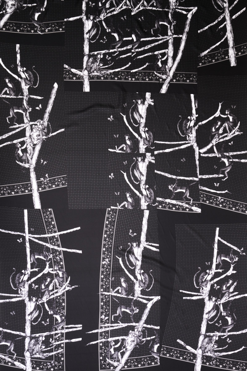 Італійська 100% шовкова саржева тканина з сірим мотивом мавпи на графітовому тлі, заповненому крихітним візерунком. Тканина поставляється в купоні довжиною 230 см і складається з готових елементів, які потрібно розкроїти. Матеріал тонкий, але непрозорий з ніжним саржевим переплетенням, нееластичний і походить з колекції відомого Модного Дому. Фантастична пропозиція для шанувальників тваринного дизайну, які шукають оригінальності та неординарності.
