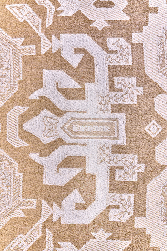 Італійська жакардова тканина з шовком з кремовими ацтекськими візерунками на золотому тлі. Малюнок досить щільний, великий і красиво переливається. Тканина тонка, нееластична, злегка прозора, дуже легка і повітряна. Унікальна пропозиція, з якої можна начаклувати сукню, спідницю, туніку, а також шаль або шарф.