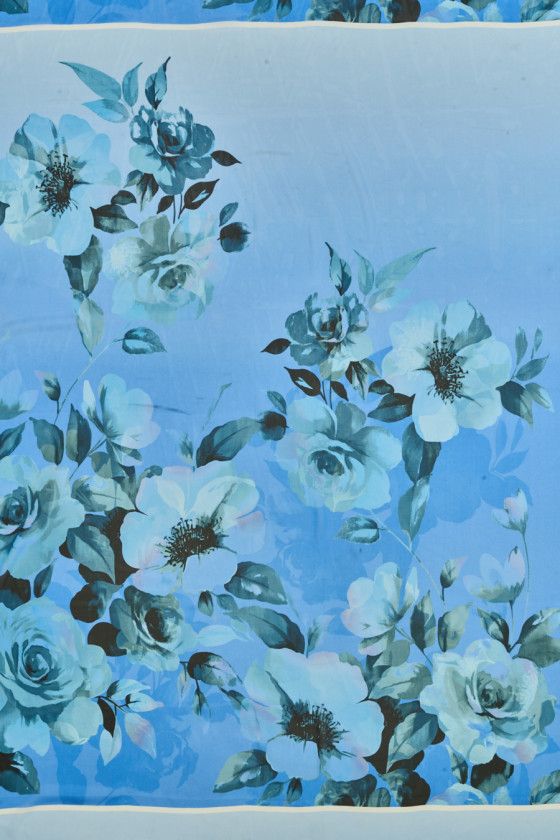 Італійський шифон 100% шовк з мотивом великих синіх квітів на синьому тлі. Тканина поставляється в купонах з розмірами 140 см * 135 см. Матеріал легкий, повітряний, прозорий, нееластичний і матовий. Романтична пропозиція ідеально підходить для повітряних суконь, спідниць, а також блуз і шарфів.