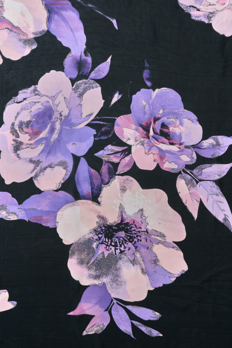 Італійський шифон 100% шовк з мотивом великих, фіолетових квітів на чорному тлі. Тканина поставляється в купонах з розмірами 140 см * 135 см. Матеріал легкий, повітряний, прозорий, нееластичний і матовий. Романтична пропозиція ідеально підходить для повітряних суконь, спідниць, а також блуз і шарфів.