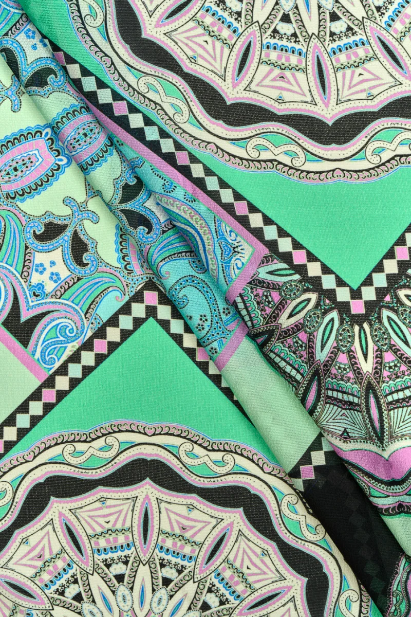 Італійська тканина, виткана з 100% натурального шовку зі східно-геометричними мотивами. Великі візерунки в свіжих відтінках зеленого, рожевого, блакитного, загострені чорними елементами. Тканина з ніжним жакардовим переплетенням злегка прозора, струмлива, приємна на дотик і нееластична. Чудова пропозиція для суконь, спідниць, блуз та шалей.