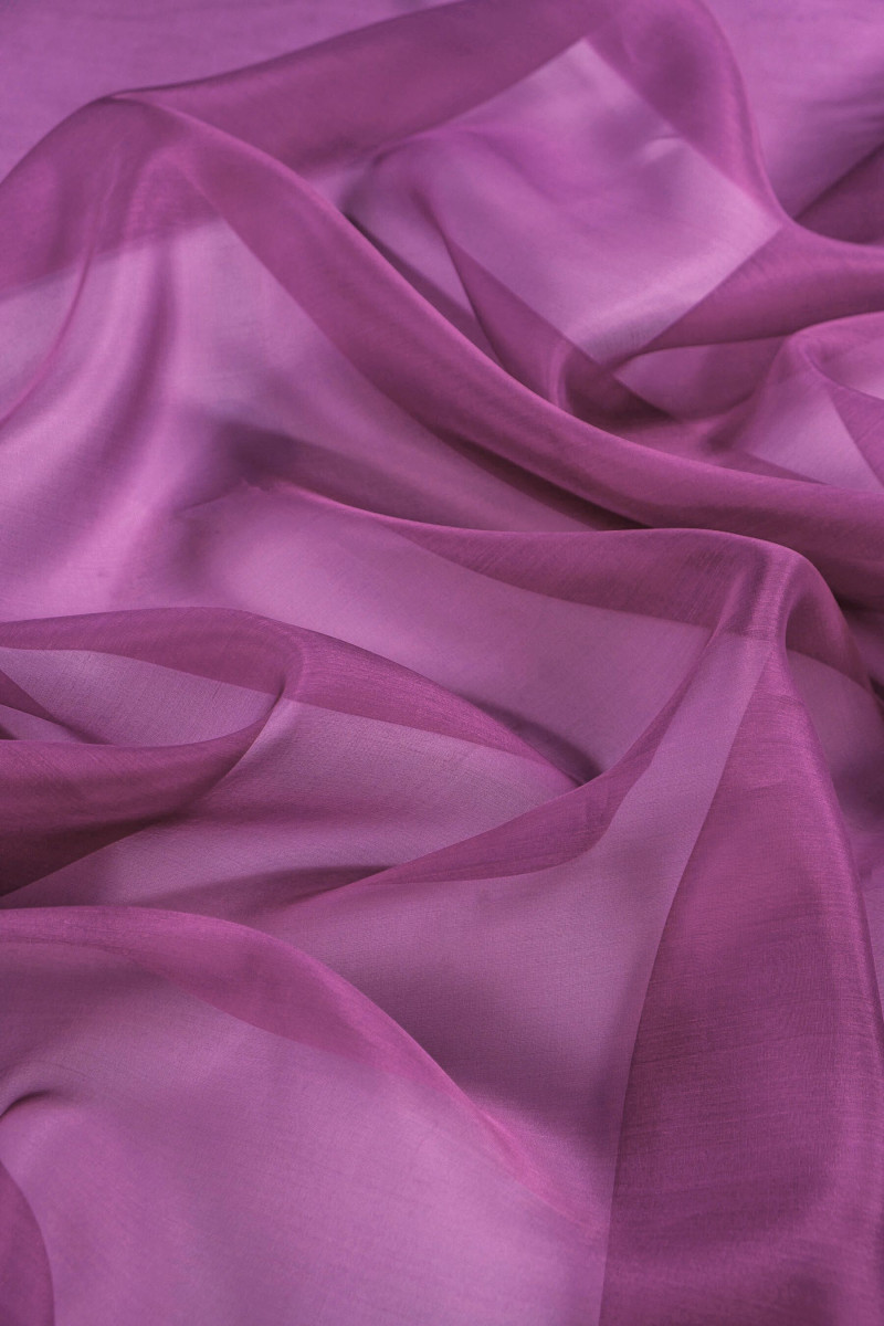 Італійська 100% шовкова тканина органза фіолетового кольору з краплею рожевого кольору фуксії. Органза з натурального шовку - це тонка, прозора, але жорстка тканина з ніжним блиском, характерним для шовкових тканин. Відмінно підійде для пошиття сукні, блузки, сорочки, спідниці.