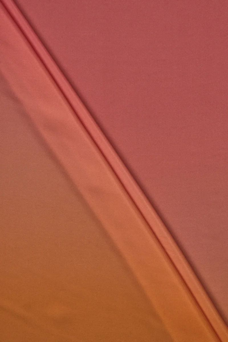 Італійський 100% шовковий атлас з ефектом омбре в рожевому та помаранчевому кольорах. Малюнок, надрукований на матовій стороні, переходить від помаранчевого на одному краю тканини до рожевого на іншому краю - рекомендуємо шити по колу. Тканина струмлива, м'яка, дуже приємна на дотик і нееластична. Прекрасна пропозиція в енергійних кольорах для суконь, спідниць і сорочок.
