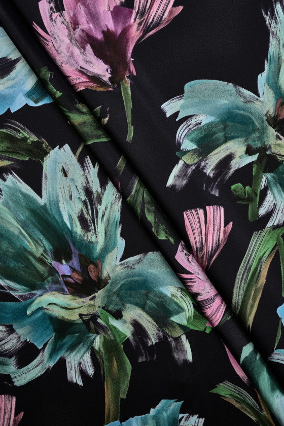 Італійський шовковий атлас з додаванням еластану з мотивом великих, пофарбованих пензлем квітів на дуже темному, темно-синьому тлі. Щільний візерунок, виконаний у відтінках бірюзи і рожевого вересу, найбільша квітка має розміри 23 см * 27 см. Тканина струмлива, м'яка, еластична і красиво блискуча, що надає їй неповторну елегантність. Вона відмінно підійде для повітряних суконь, спідниць, а також блуз і сорочок.