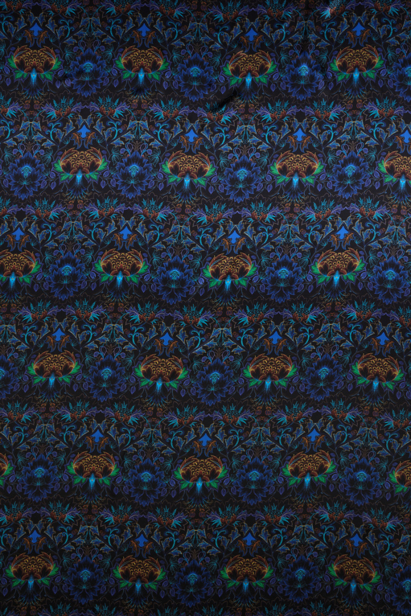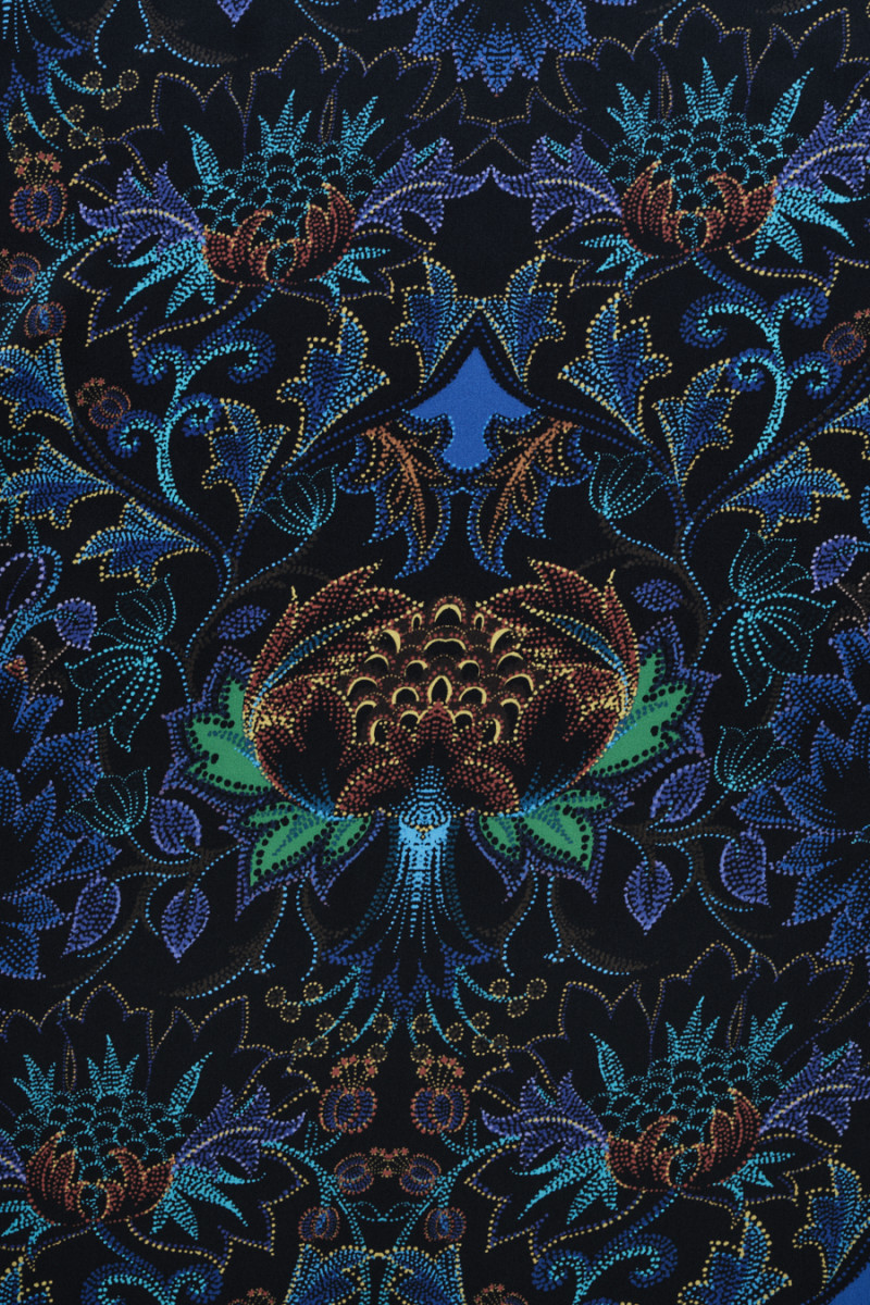 Італійський атлас 100% шовк з мотивом східних квітів на чорному тлі. Щільний візерунок, виконаний в досить яскравих відтінках волошки, помаранчевого, зеленого і бірюзового кольору у вигляді крихітних точок, що створюють цікаву, східну рослинність. Тканина струмлива, м'яка, не еластична і красиво блискуча, що надає їй неповторну елегантність і походить з колекції відомого модельєра. Цікава пропозиція, яка добре поєднується з повітряними сукнями, спідницями, а також блузами та сорочками.