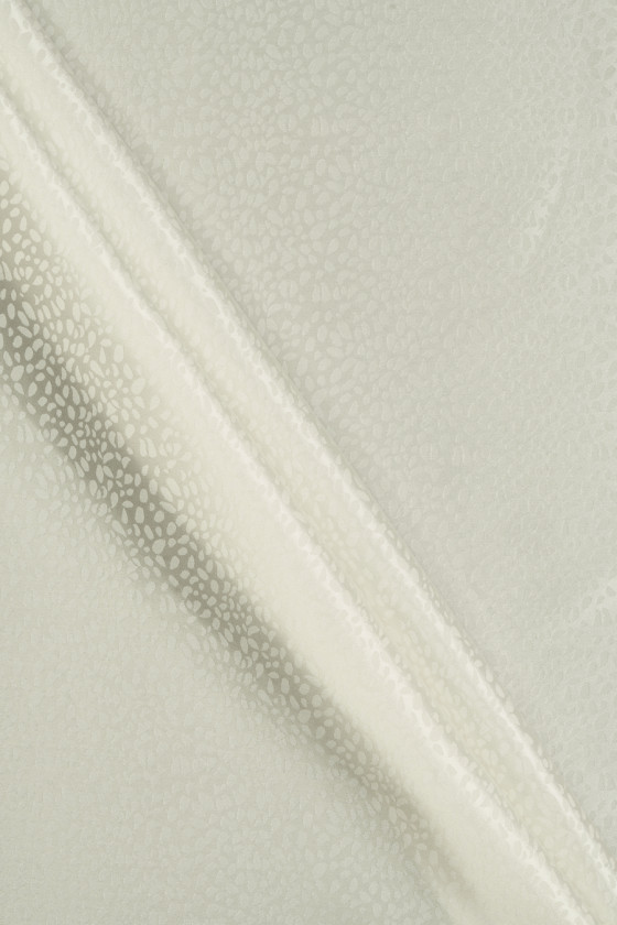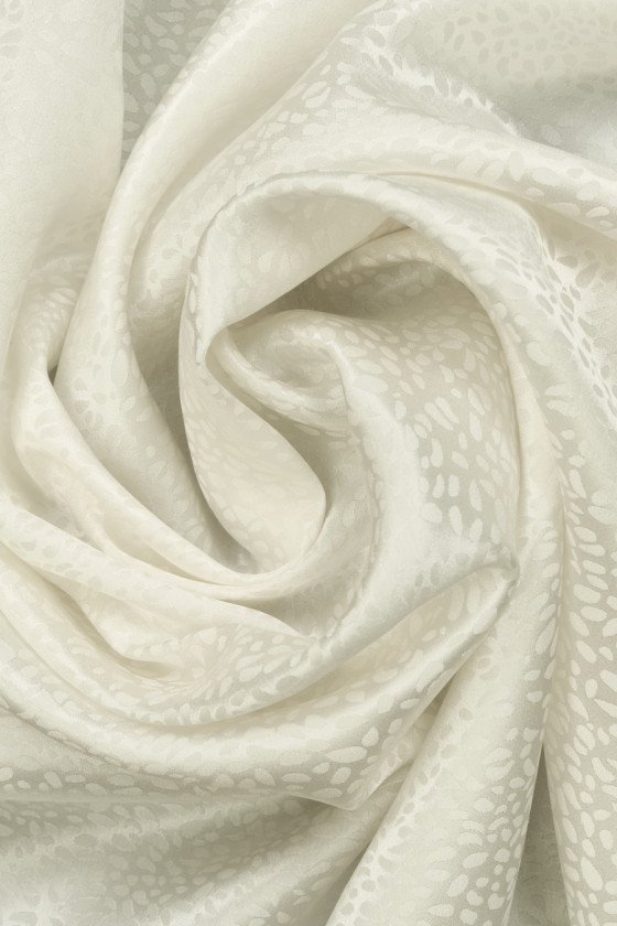 Італійська 100% шовкова тканина кремового кольору. Тканина має щільне атласне переплетення з тонким, матовим леопардовим малюнком. Він тонкий, але непрозорий, повітряний і нееластичний. Фантастична пропозиція для пошиття легкої блузки або сукні. Якщо вам подобаються благородні тканини в позачасовому кольорі, ця тканина саме для вас.