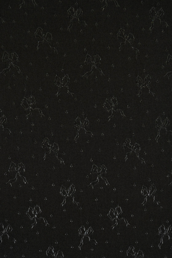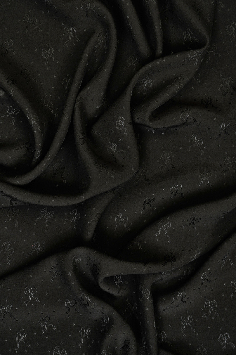 Італійська шовкова тканина чорного кольору. Тканина має щільне структурне переплетення з щільним малюнком бантиків (2см) і дрібними точками. Він тонкий, але непрозорий, повітряний і еластичний. Фантастична пропозиція для пошиття легкої блузки, сорочки або сукні. Якщо вам подобаються благородні тканини в позачасовому кольорі, ця тканина саме для вас.