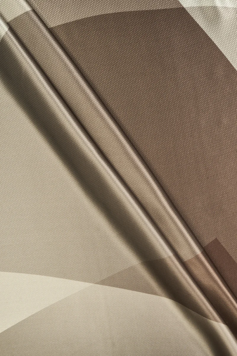 Італійський атлас зі 100% шовку з геометричним мотивом у відтінках коричневого, бежевого та сірого. Великий візерунок із зображенням кіл і трикутників, які накладаються один на одного, візерунок з дуже дрібної сітки надрукований в цілому, що надає матеріалу цікавий вигляд. Тканина непрозора, струмлива, м'яка, нееластична і глянцева. Ми рекомендуємо його для суконь, спідниць, блуз і сорочок.