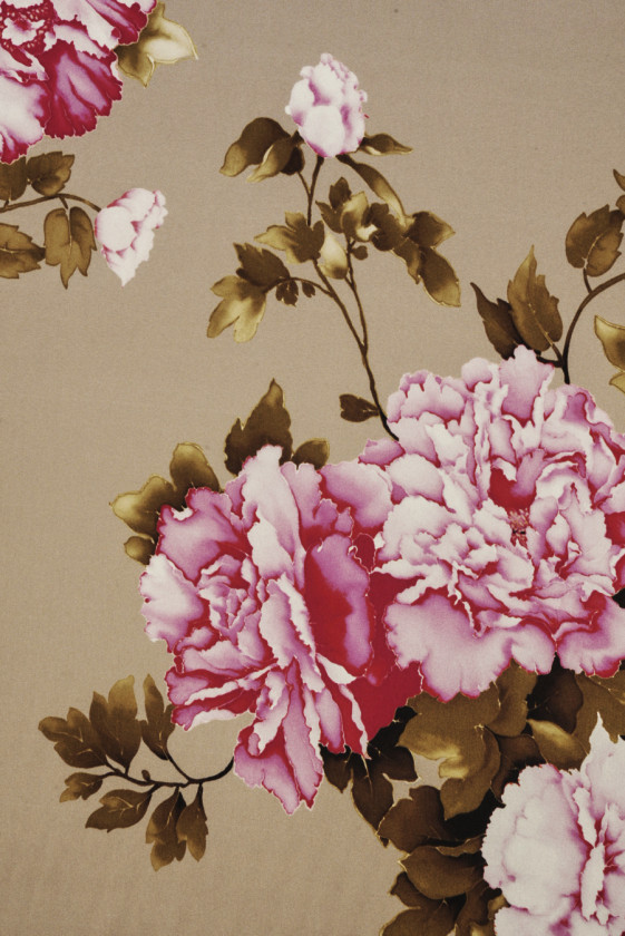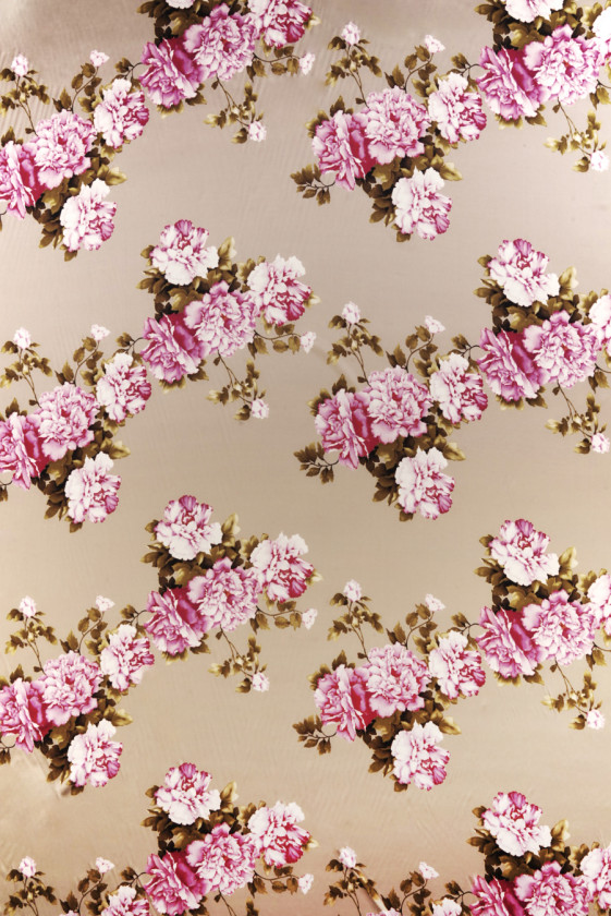 Італійський шовковий атлас з додаванням еластану, з мотивом рожевих гвоздик на світлому тлі мокко. Великі квіти, оточені листям і стеблами приглушеного зеленого кольору, розміщують по кілька поруч один з одним, утворюючи букети. Одна квітка має розмір близько 13 см * 14 см. Матеріал текучий, гнучкий, непрозорий, м'який і має красивий блиск. Романтична тканина, яку ми особливо рекомендуємо для повітряних суконь і спідниць, також ідеально підходить для блузок і сорочок.
