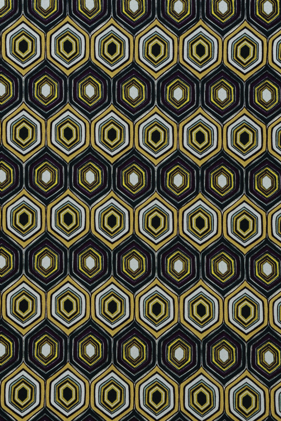 Італійський шовковий атлас з додаванням еластану, з графічним мотивом, що складається з шестикутників, розміщених поруч один з одним. Весь візерунок виконаний в жовтому, темно-фіолетовому, темно-зеленому і дуже світло-блакитному кольорі. Одна штука має розмір 3,5 см * 4,5 см. Матеріал текучий, гнучкий, непрозорий, м'який і має красивий блиск. Цікава пропозиція, яка ідеально підійде для сорочок, блуз, тунік і навіть більш вільних штанів.