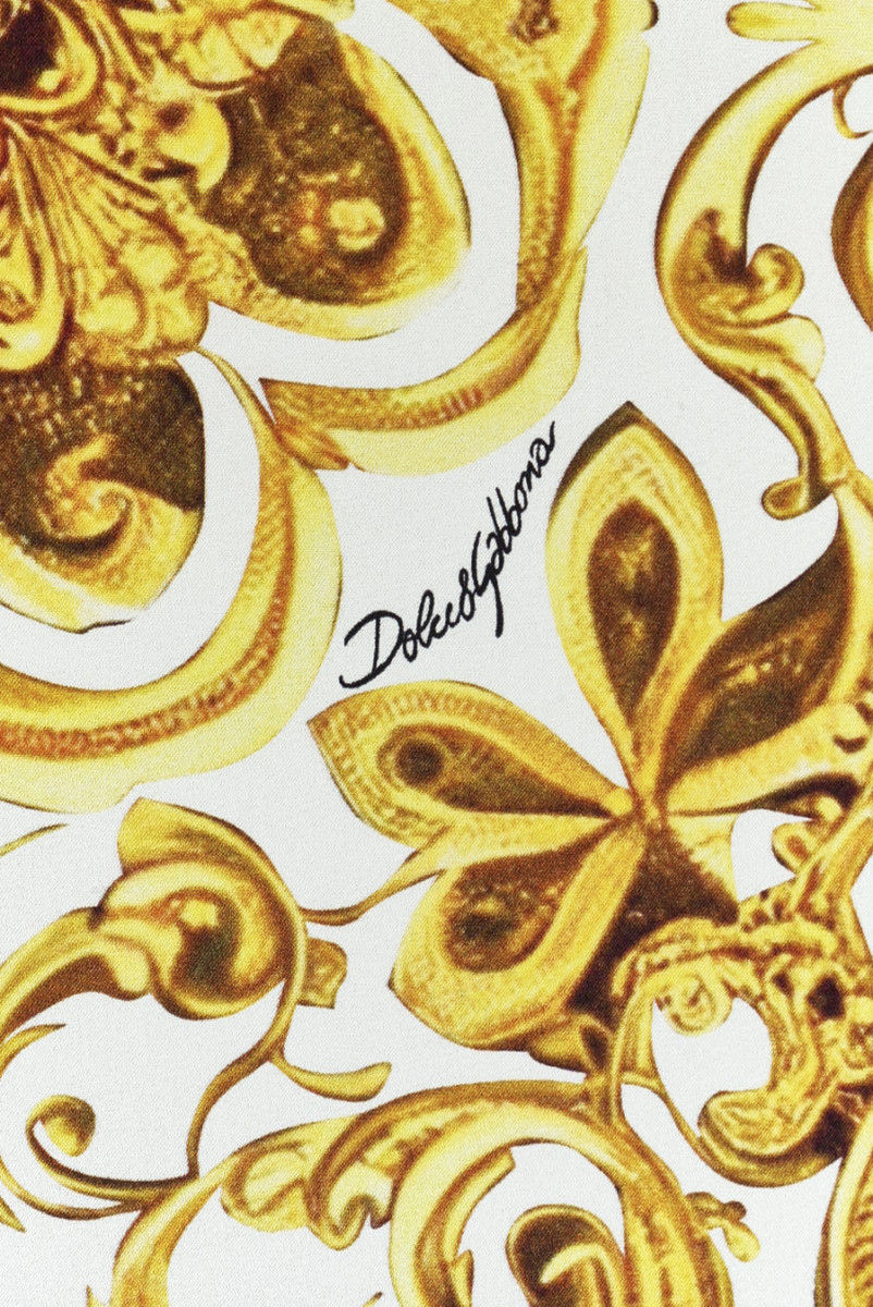 Італійський шовковий атлас з додаванням еластану з жовтим, східним мотивом на тлі кремового кольору. Щільний, правильний візерунок, характерний для відомого модного будинку. Матеріал текучий, гнучкий, непрозорий, м'який і має красивий блиск. Відмінна пропозиція для людей, які шукають тканини з автографом. Він добре працюватиме на сорочках, блузах, повітряних сукнях та спідницях.