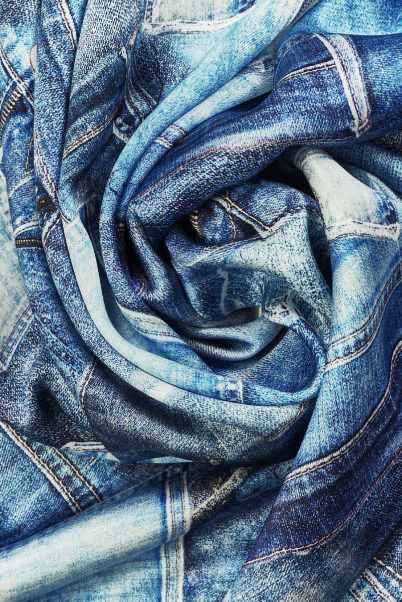 Італійський атлас 100% шовк з джинсовим мотивом в синіх відтінках. Щільний візерунок із зображенням таких елементів штанів, як блискавки, кишені, гудзики, потертості в матеріалі, потертості. Тканина струмлива, непрозора, нееластична, легка і оброблена елегантним блиском. Дуже оригінальна пропозиція, з якої можна створити блузи, сорочки, сукні та більш вільні штани.