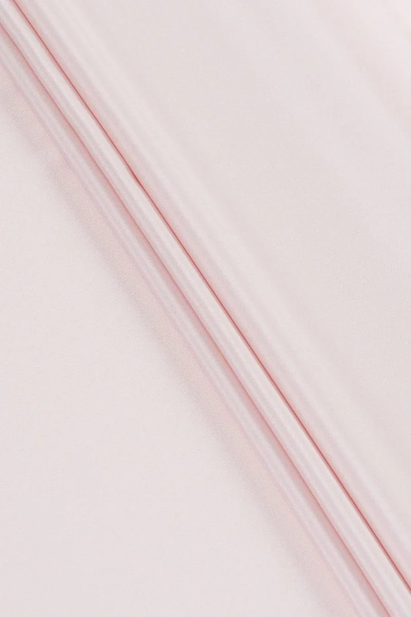 Італійська тканина сукні каді, виткана з натурального шовку з блідо-рожевим еластаном. Тканина має гладке переплетення і, як будь-яка шовкова тканина, має благородний, делікатний блиск. Він ідеально підходить для шиття блузки, сорочки, а також легкої сукні, спідниці або широких штанів.