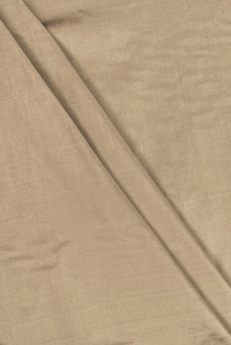 Італійська 100% шовкова тканина шантон у холодному бежевому кольорі. Тканина гладша з невеликими потовщеннями. Він непрозорий, нееластичний, досить жорсткий і дуже елегантний. Вона ідеально підходить для вечірніх суконь, спідниць, блузок і жакетів.