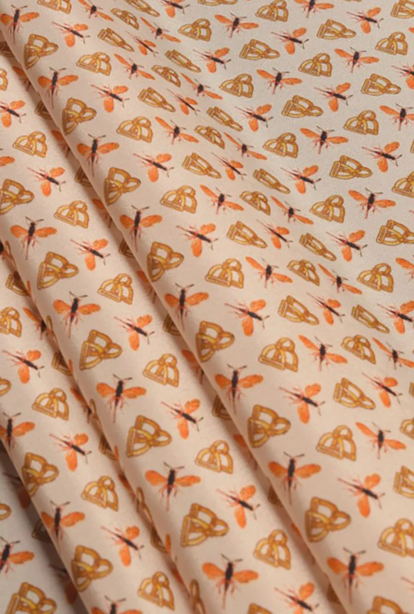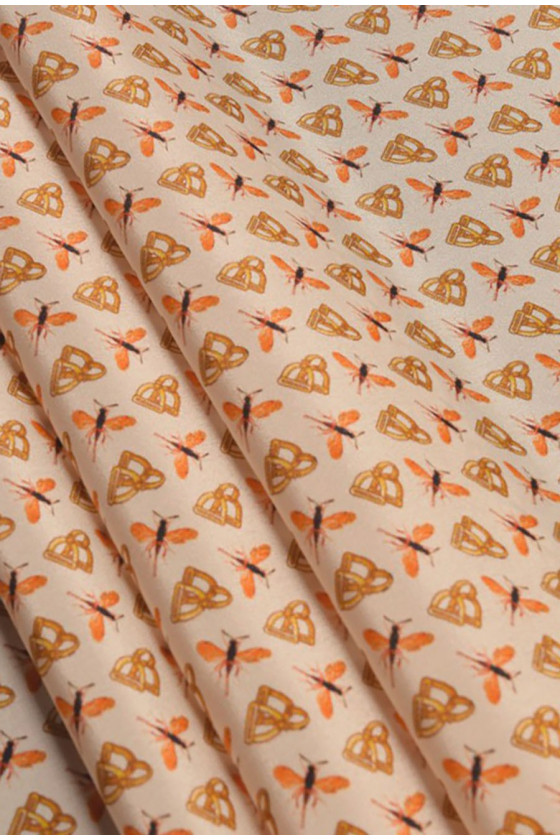 Шовковий креп - ніжна, тонка, але непрозора, напівматова тканина. З його допомогою можна чаклувати над повітряними сукнями, ніжними блузами, шарфами, хустками. Забавний, дрібний принт комах і стремен.