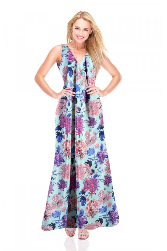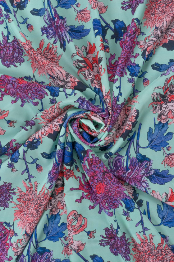 100% шовковий креп з принтом великих, барвистих квітів на світло-бірюзовому тлі. Це ніжна, тонка, але непрозора, напівматова тканина. З його допомогою можна чаклувати над повітряними сукнями, ніжними блузами, шарфами, хустками.