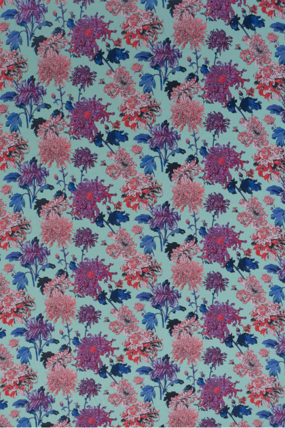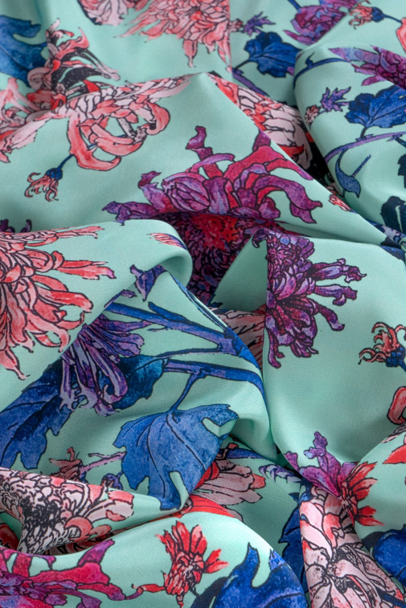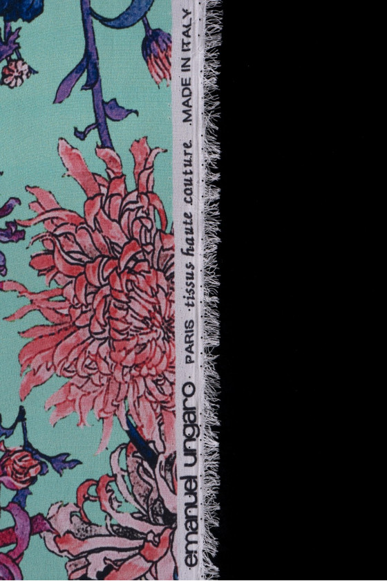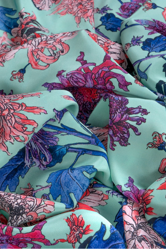 100% шовковий креп від відомого модельєра в принті з великих, барвистих квітів на світло-бірюзовому тлі. Це ніжна, тонка, але непрозора, напівматова тканина.