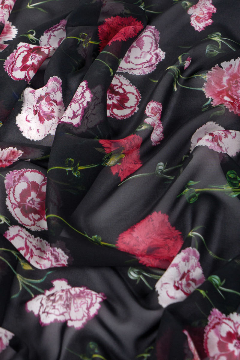 Шифон з натурального шовку - дуже ніжна, повітряна і прозора тканина. Ідеально підходить для повітряних суконь і блуз. Нееластична тканина. N чорна фонова гвоздика.