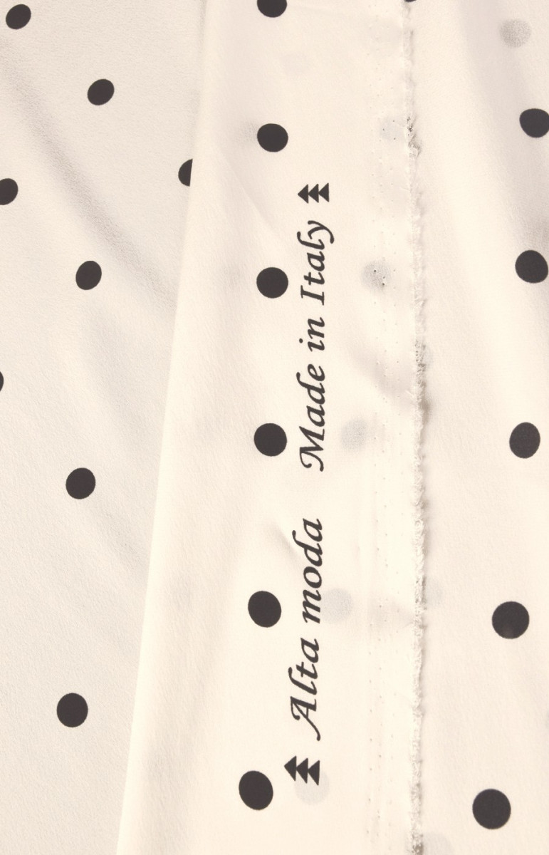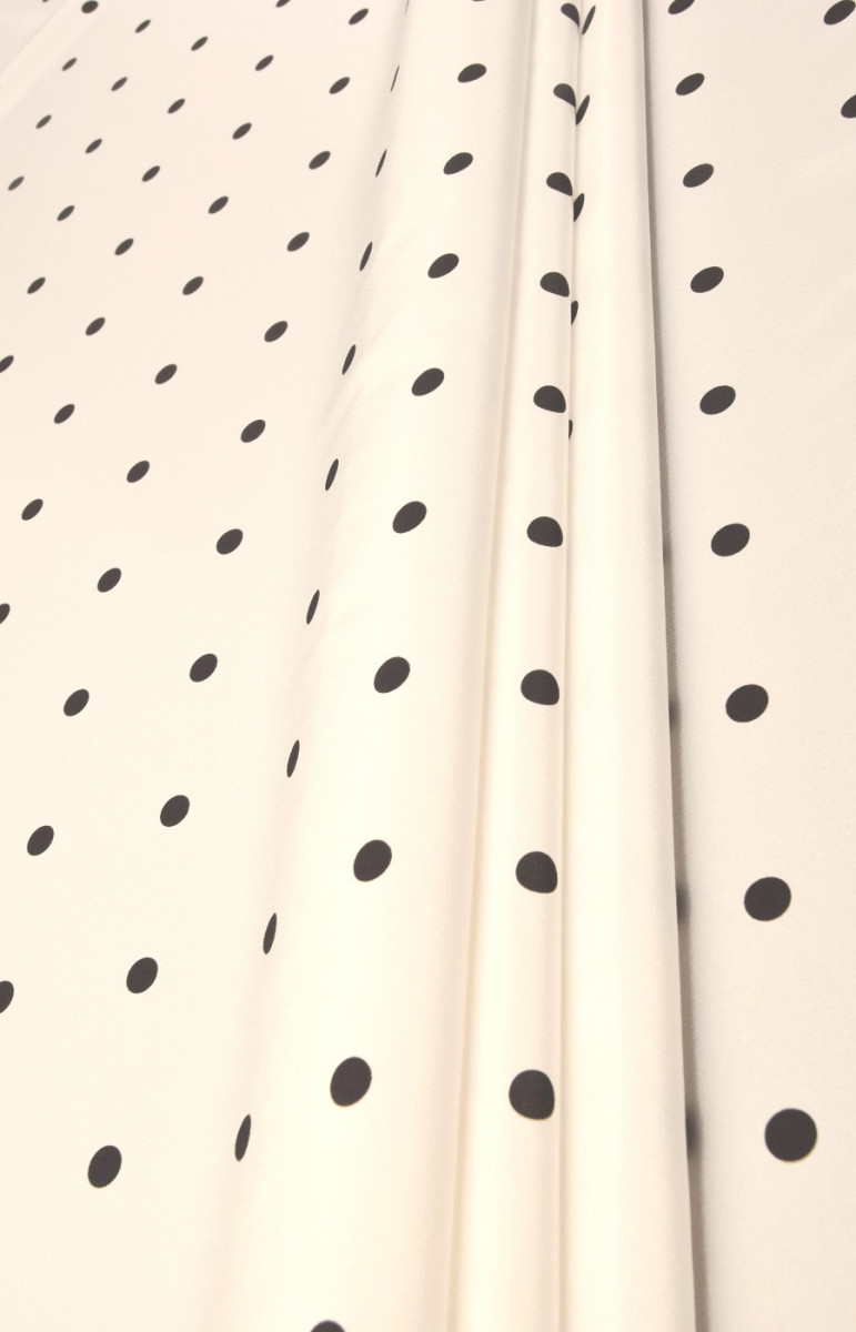 Шовковий креп в горошок - ніжна, тонка, але напівнепрозора тканина з легким блиском. З його допомогою можна чаклувати над повітряними сукнями, ніжними блузами, шарфами, хустками. Рекомендуємо вибирати підкладку. Кольори: чорний горошок на екрю.