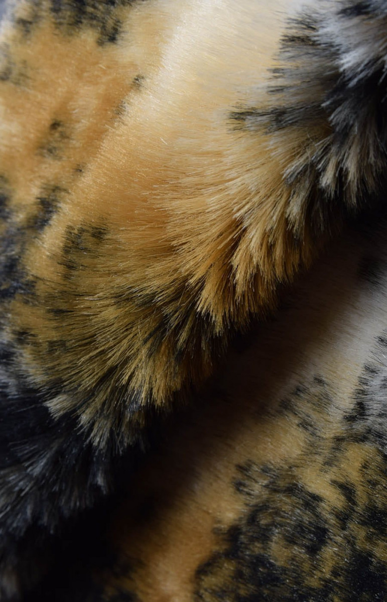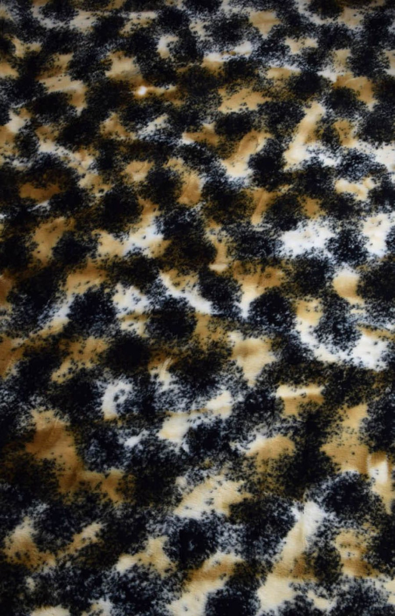 Італійська імітація хутра чорного, бежевого та кремового кольорів з плямами, схожими на плями. Тканина більш щільна, злегка жорстка з ворсом довжиною близько 0,5 см. Ідеально підходить для пошиття зимового пальто, куртки, жилета або як завершальний штрих до інших тканин. Також його можна використовувати в декоративних цілях.