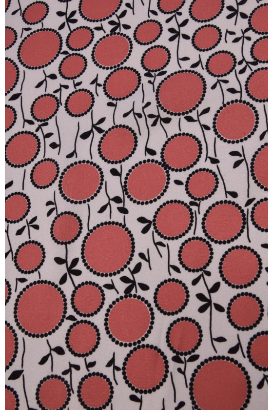 Атлас з поліестеру з щільним малюнком - кола 1,5-2,5 см. Рекомендуємо шити з нього літні сукні, блузи та спідниці. Вона не прозора, можна пришити її без підкладки. Граммаж підходить і для пошиття жіночих сорочок. Кольори: кружечки лососевого кольору на тлі екрю.