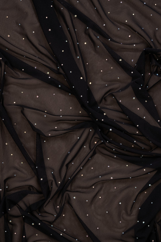 Італійська еластична сітка в обидві сторони в чорному кольорі з наклеєним різнокольоровим діоксидом цирконію. Тонка, прозора, м'яка, еластична тканина - відмінно підійде для пошиття вечірньої блузки, сукні, спідниці або для обробки.