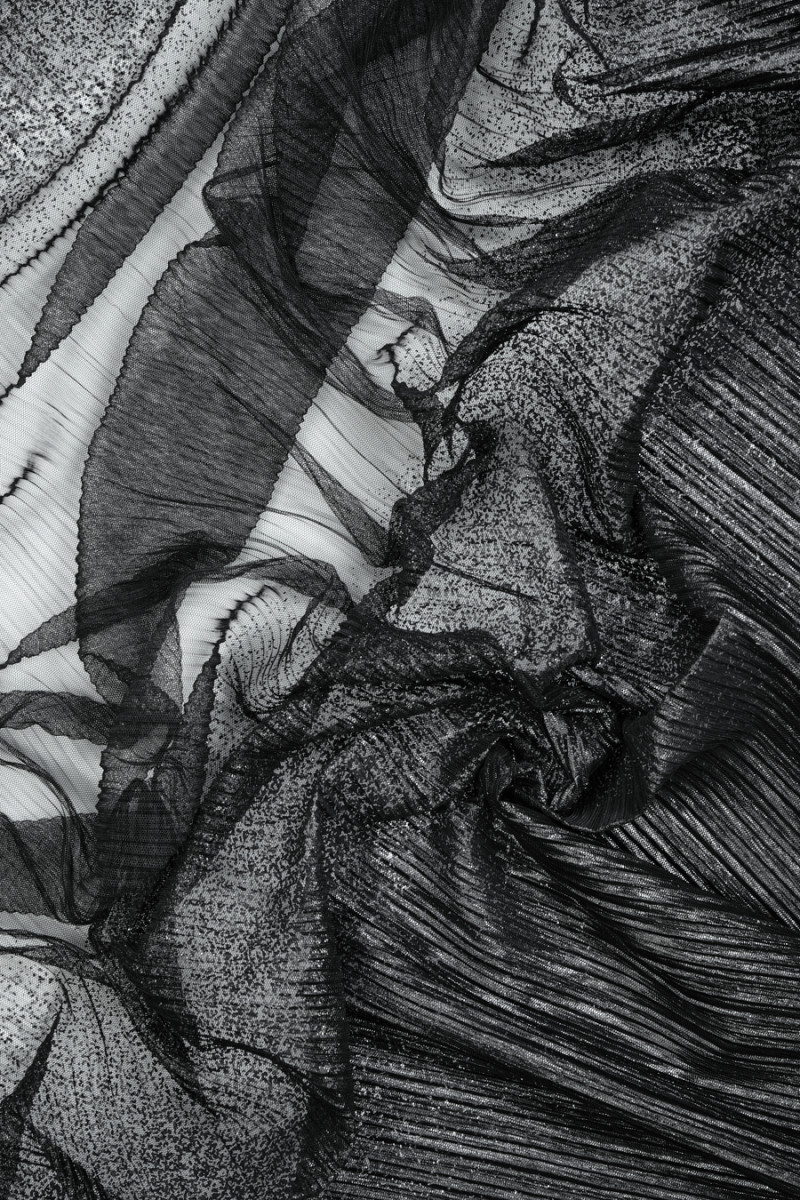 Декоративний тюль з дрібною плісировкою чорного кольору. По обидва краї тканини є чорна блискуча фольга, яка знижує її щільність, перетворюючись в крихітні плями, які закінчуються на висоті 49 см. Тканина прозора, еластична, легка, злегка жорстка в місцях, де є фольга. Цікава пропозиція, з якої можна створити офіційний наряд, наприклад, плаття або спідницю.