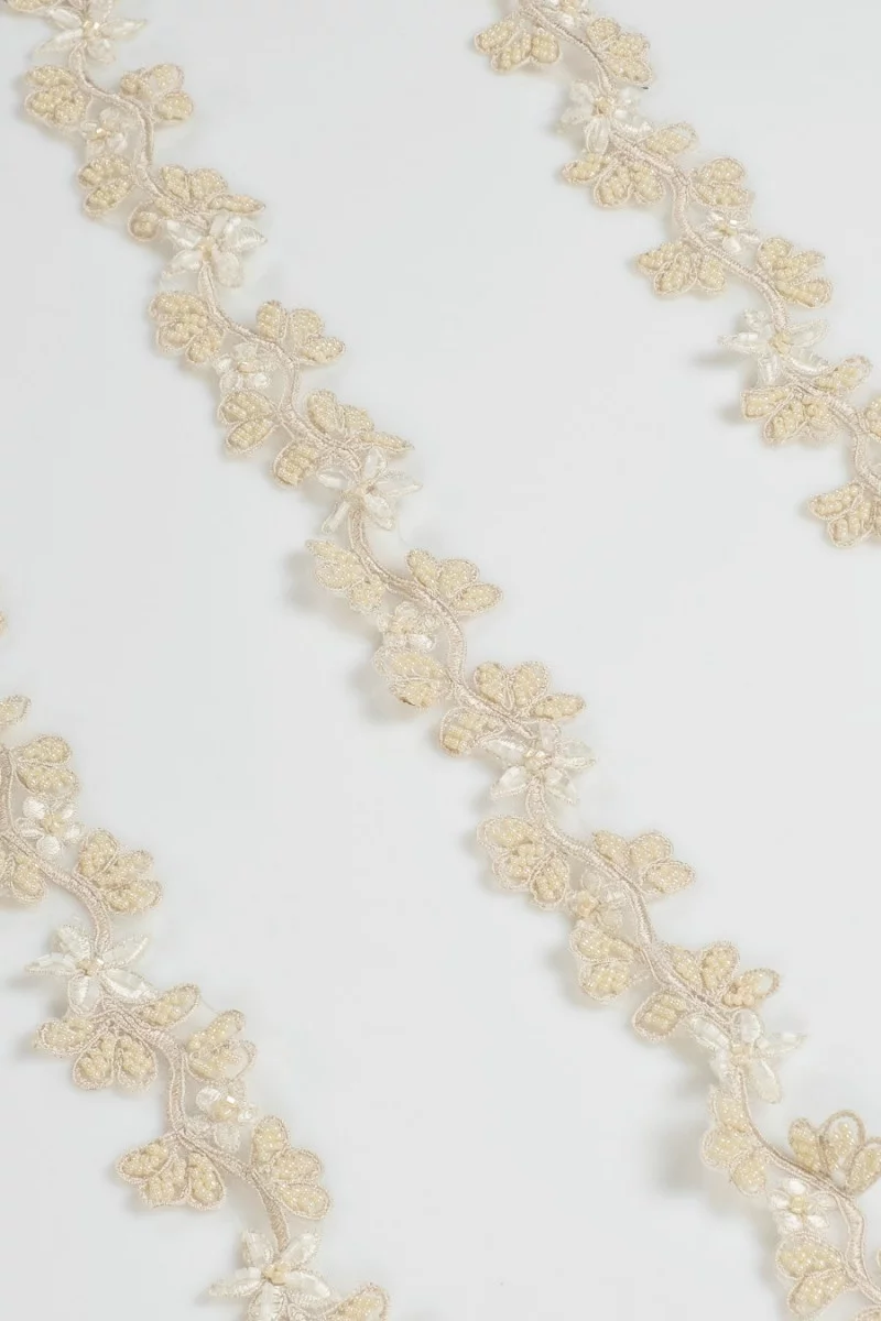 Італійська галантерейна стрічка світло-бежевого кольору і екрю. Мотив квітів і листя, розшитих бісером. Ідеально підходить для обробки весільних і вечірніх тканин.