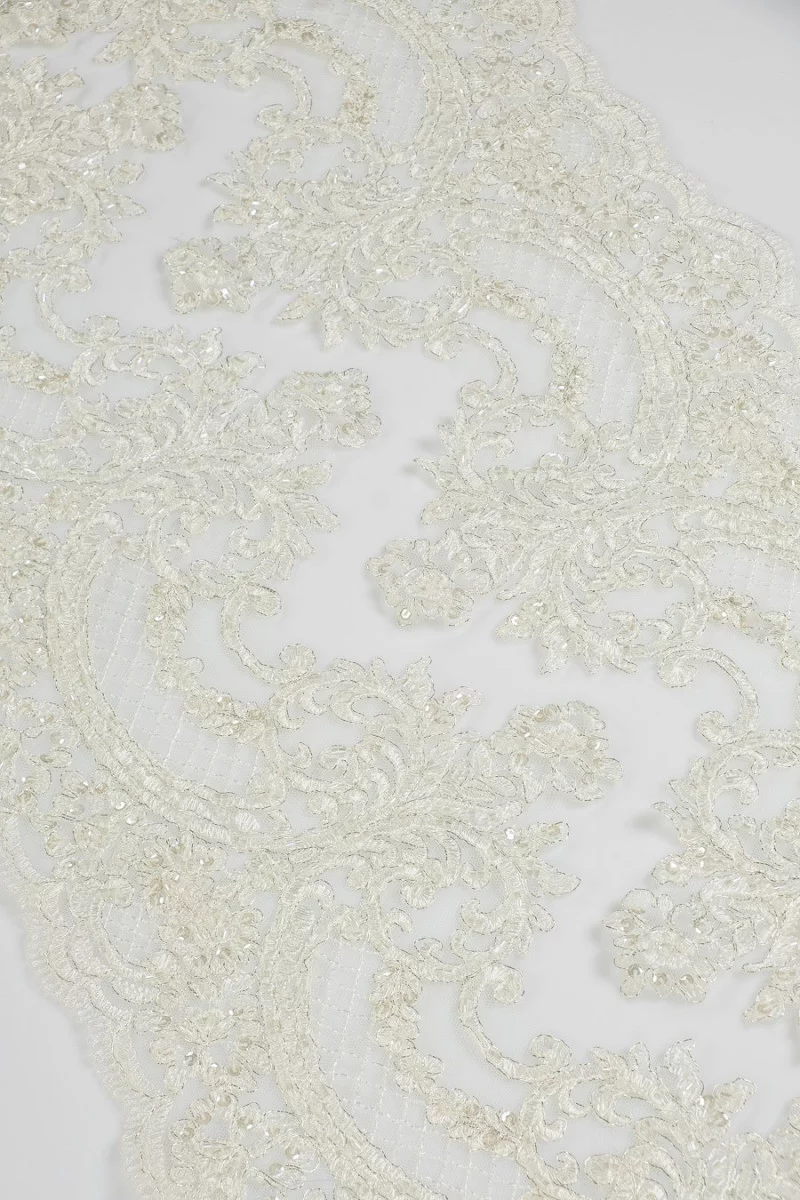Італійська галантерейна стрічка в кольорі екрю зі срібною ниткою, закінчена зубцем з одного боку. Красивий, великий мотив, прикрашений дрібним бісером. Ідеально підходить для обробки весільних і вечірніх тканин.