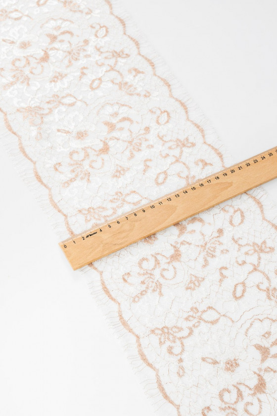 Італійська мереживна стрічка білого кольору і міді, оброблена з двох сторін зубцем (підлягає розрізанню). Квітковий мотив. Ширина: 20 см