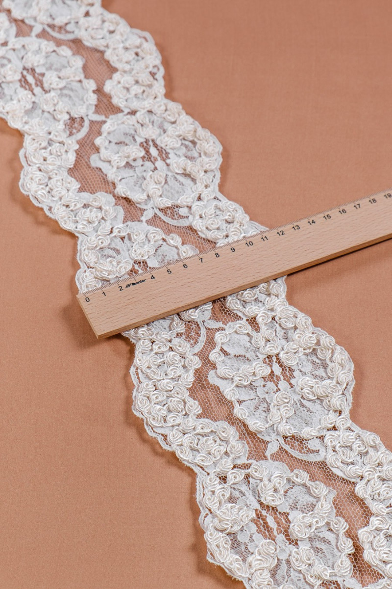 Італійська галантерейна стрічка - мереживо шириною 13 см. Квітковий мотив, прикрашений ниткою у вигляді «завитків» кремового кольору. Стрічка оброблена з двох сторін зубом.