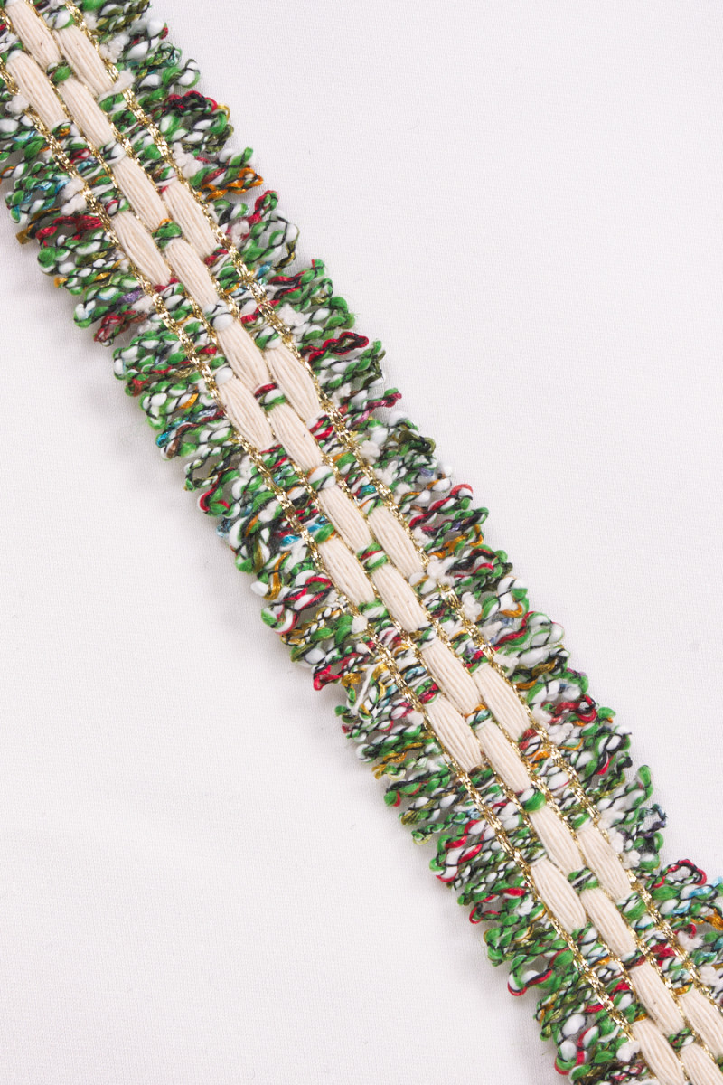 Італійська галантерейна стрічка Шанель зеленого кольору, шириною 2,5 см. Стрічка виконана в переважаючих кольорах: зеленому, кремовому, червоному і прикрашена золотою люрексовою ниткою. Ідеально підходить для обробки тканин Шанель.