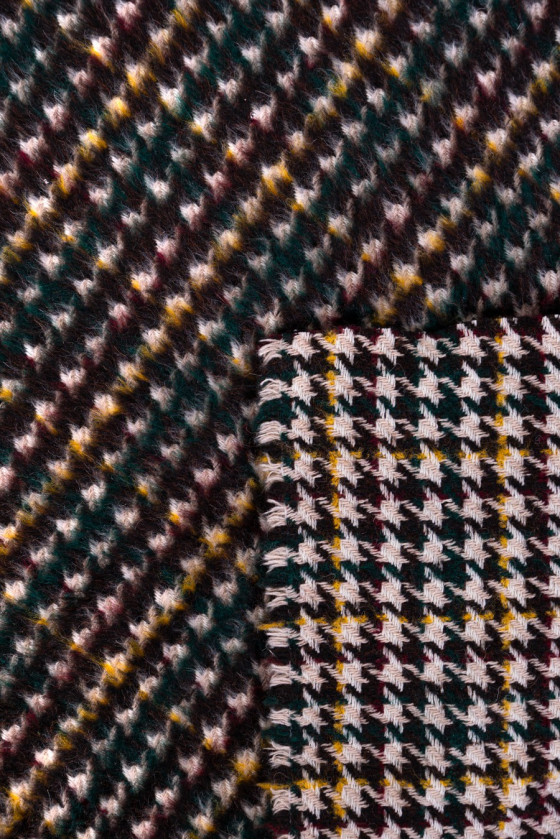 Італійська пальтова тканина - двостороння, з барвистим мотивом курячої лапки. Одна сторона гладка, інша з більш довгим волоссям. Тканина більш щільна, дуже приємна на дотик - відмінно підійде для пошиття пальто, куртки, жилета, пончо. Рекомендуємо хімчистку