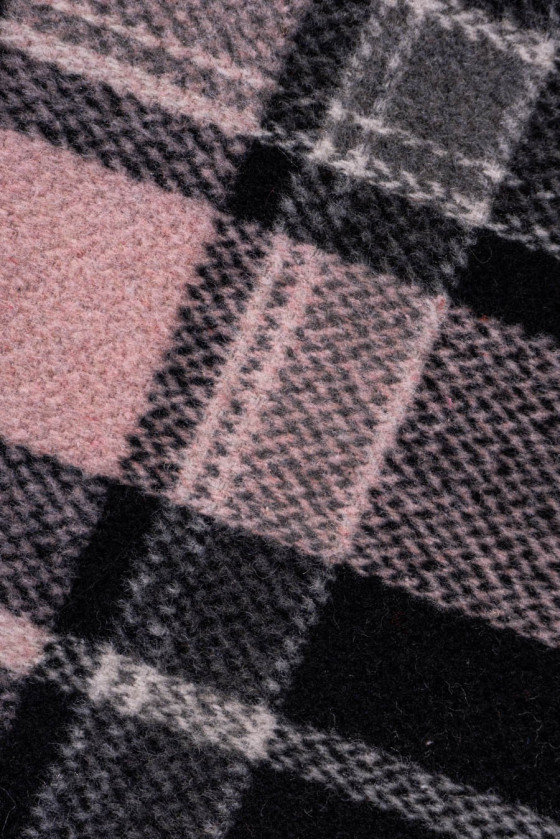 Італійська пальтова тканина з великою клітинкою (близько 8 см) в світло-рожевому і чорному кольорах. Виткані з натуральної вовни і поліаміду. Вовняні тканини ідеально підходять для верхнього одягу (пальто, куртка, жилет), тому що вони зігрівають і в той же час дозволяють шкірі дихати.