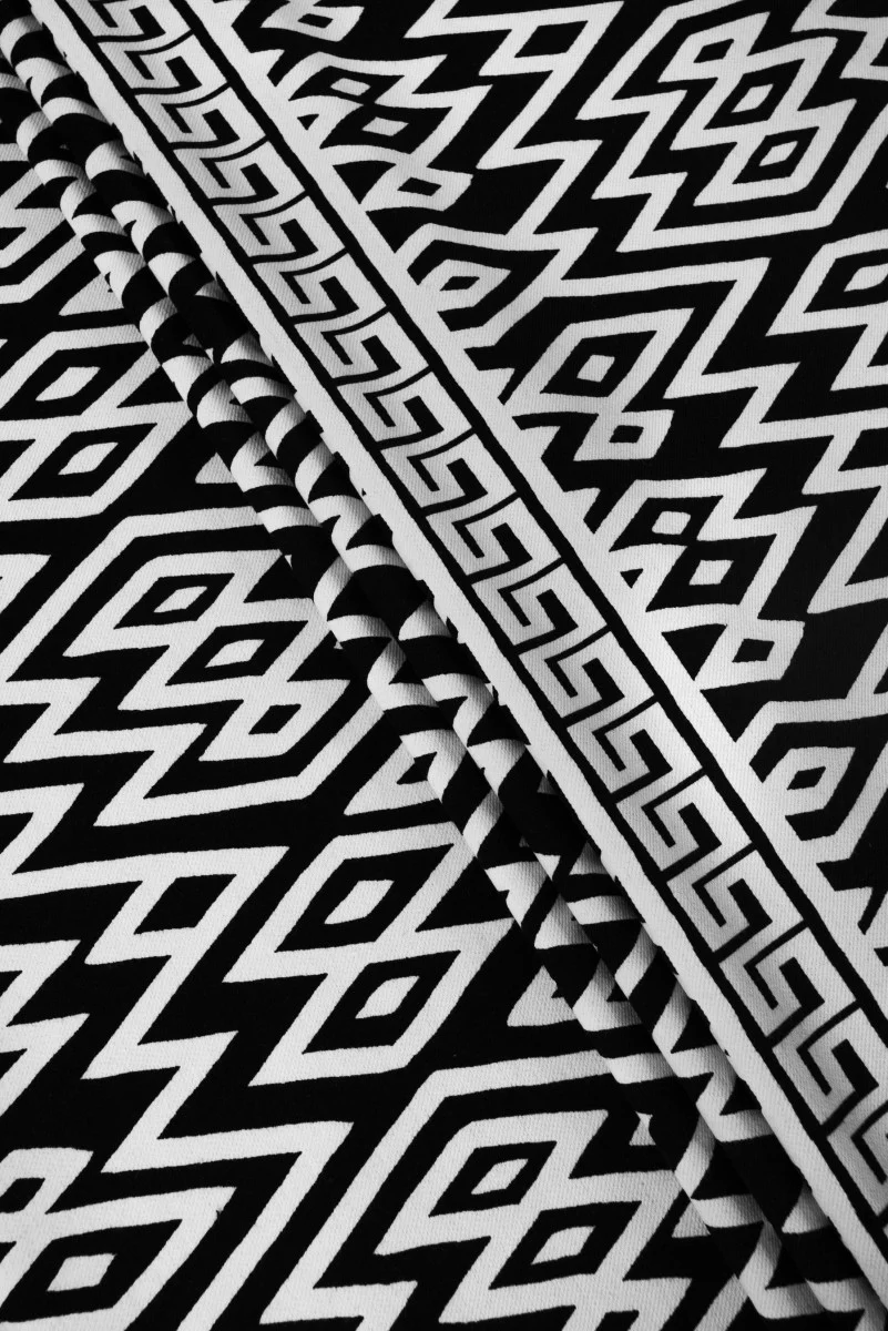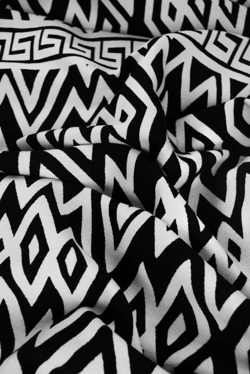 Італійська пальтова тканина в купонах розміром 190см*145см. Купон з кремово-чорним зигзагоподібним мотивом, оброблений декоративною облямівкою - його можна пришити з двох сторін. Більш щільна, жорстка тканина з саржевим переплетенням - суміш натуральної вовни і шовку.