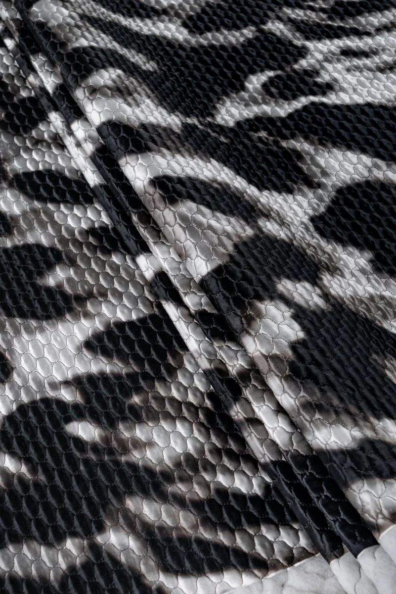 Останній купон цікавої, двосторонньої стьобаної тканини. З одного боку, з малюнком з великих, темно-коричневих плям на білому тлі, з іншого без малюнка в сірому і кам'яному кольорі. Купон має довжину 180 см і ширину 150 см. Він відмінно підійде під коротку куртку або жилет.
