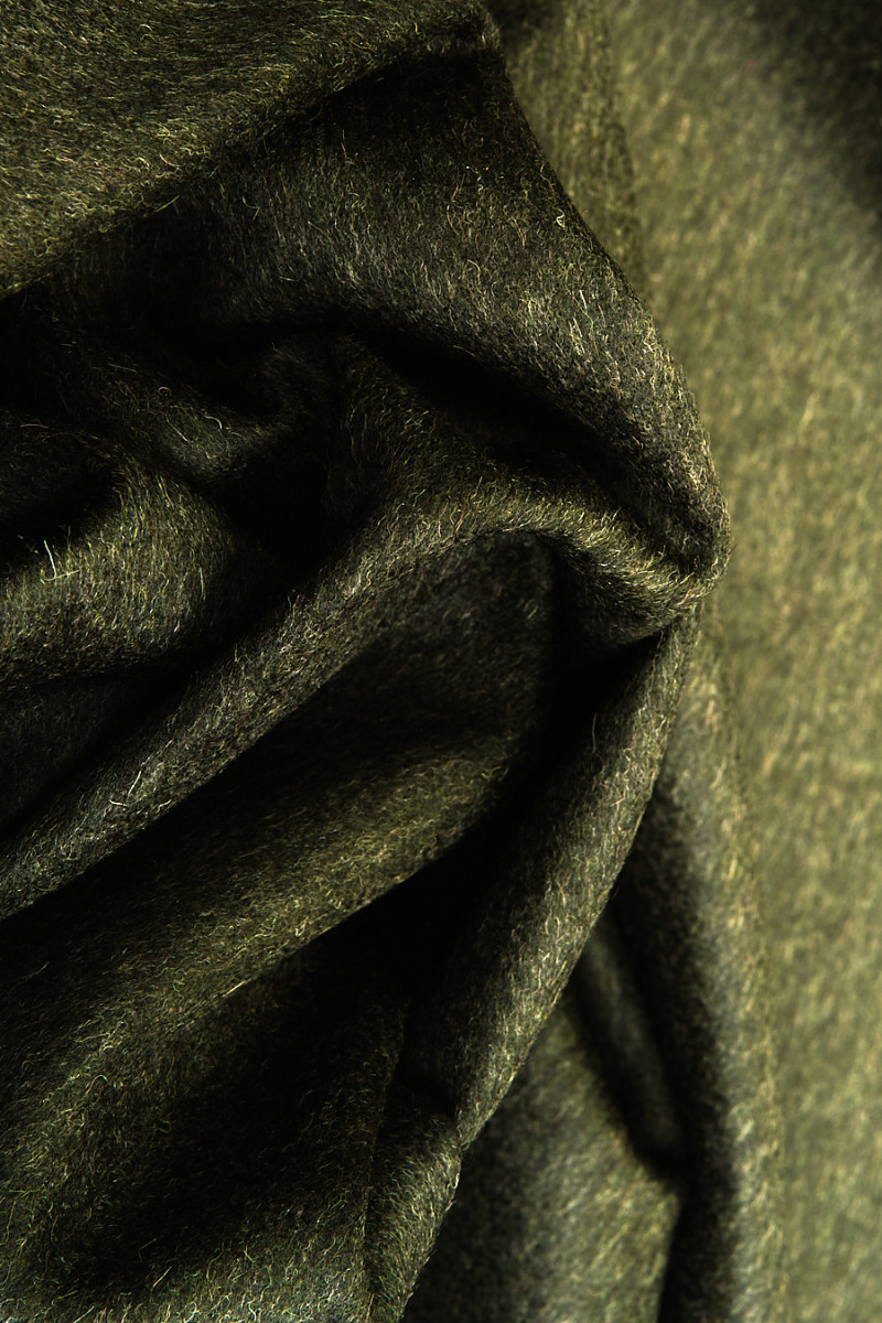 Шерсть італійського вергін темно-зеленого кольору, яка ламана більш світлими волосками. Дуже м'яка, благородна тканина з ніжним блиском і більш коротким, пресованим ворсом, відмінно підійде для пошиття осінньо-зимового пальто, куртки або теплого жилета. Найякісніший склад робить тканину не тільки красивою на вигляд, але і дуже теплою. Тканина відмінно підійде для людей, які люблять класику в найвищому тиражі.