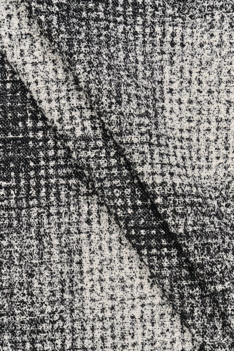 Італійське пальто з вовни з домішкою віскози і поліаміду в чорно-кремовому кольорі. Дуже м'ясиста, благородна тканина з опуклим переплетенням, що нагадує букле. Цікаве переплетення двох кольорів ниток створює великий картатий мотив. Він відмінно підійде для пошиття осінньо-зимового пальто, куртки або теплого жилета. Поєднання натуральних волокон з синтетичними призводить до того, що тканина виходить теплою, але в той же час міцною і довговічною. Красива і дуже оригінальна тканина для людей, які люблять незвичайні матеріали за хорошою ціною.