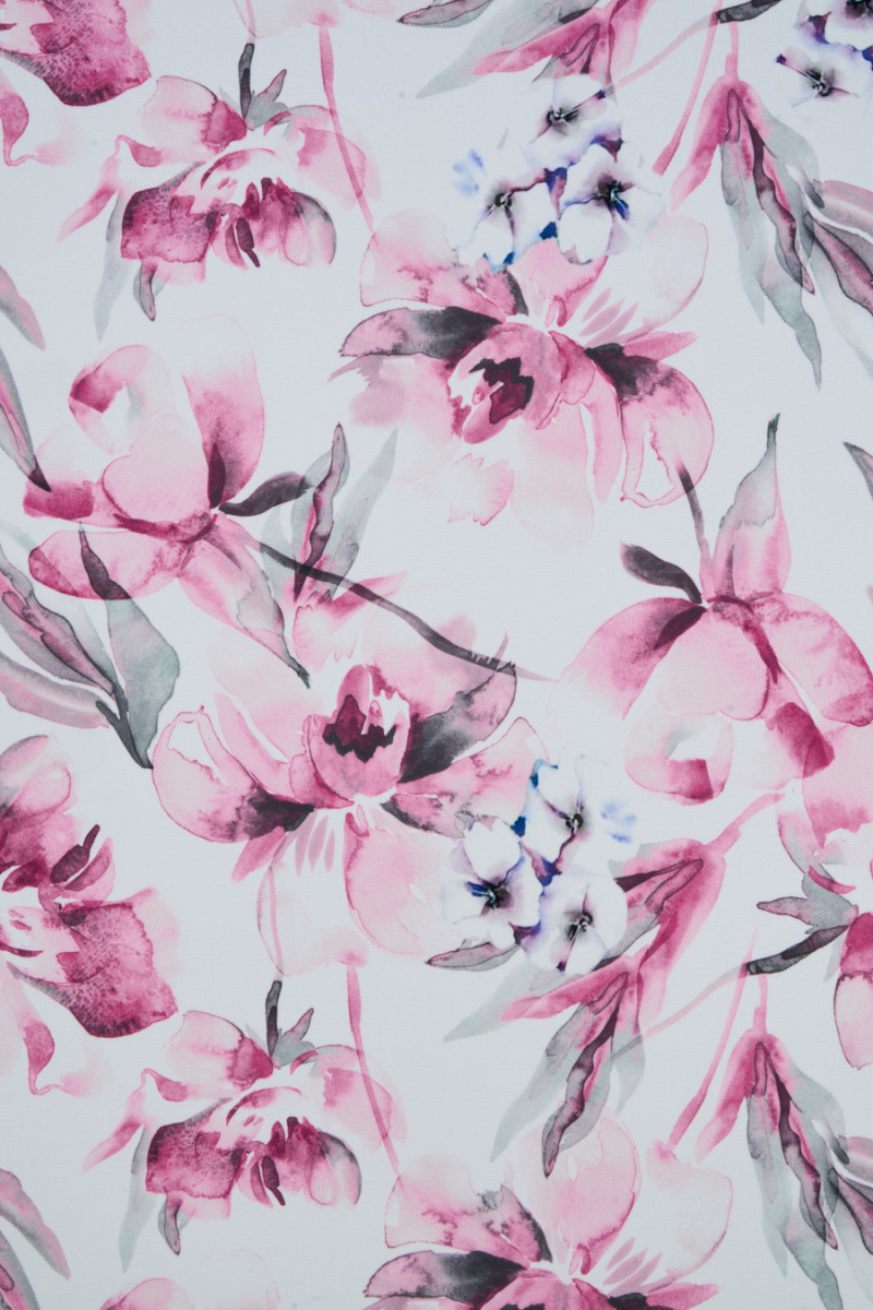 Італійська тканина каді з поліестеру з мотивом рожевих квітів на білому тлі. Щільний малюнок злегка розмитий, доповнений сірими кольорами, завдяки чому набуває неповторного вигляду. Тканина м'ясиста, струмлива, з гладким, щільним переплетенням, злегка еластична. Він ідеально підійде для пошиття спідниці, сукні та костюма. Фантастична пропозиція для людей, яким подобається квітковий дизайн.