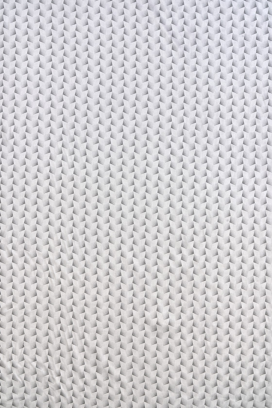 Італійська сорочкова тканина, 100% ліоцелл з мотивом маленьких квадратиків з чорних крапок на білому тлі. Візерунок щільний, з переходом чорних крапок від меншого розміру до більшого. Тканина тонка, досить непрозора, м'яка, дуже приємна на дотик і легко працює на волокнах. Він ідеально підходить для сорочок, блуз, суконь і шортів.