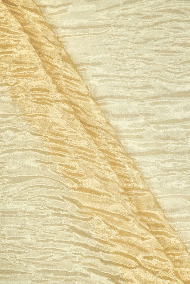 Тканина поліестер жовтого кольору з ефектом зминання. Дуже ніжний і ледь помітний візерунок з хвиль і ліній виконаний в цілому. Тканина прозора, нееластична і злегка жорстка. Вона складається з двох тонких, з'єднаних між собою шарів в місцях малюнка - верхній шар виконаний з жовтої, блискучої нитки, а нижній - з глянцевої білої, що надає тканини пухнастий ефект. Цікавий матеріал, який добре підійде для суконь, спідниць, декоративних шарфів.